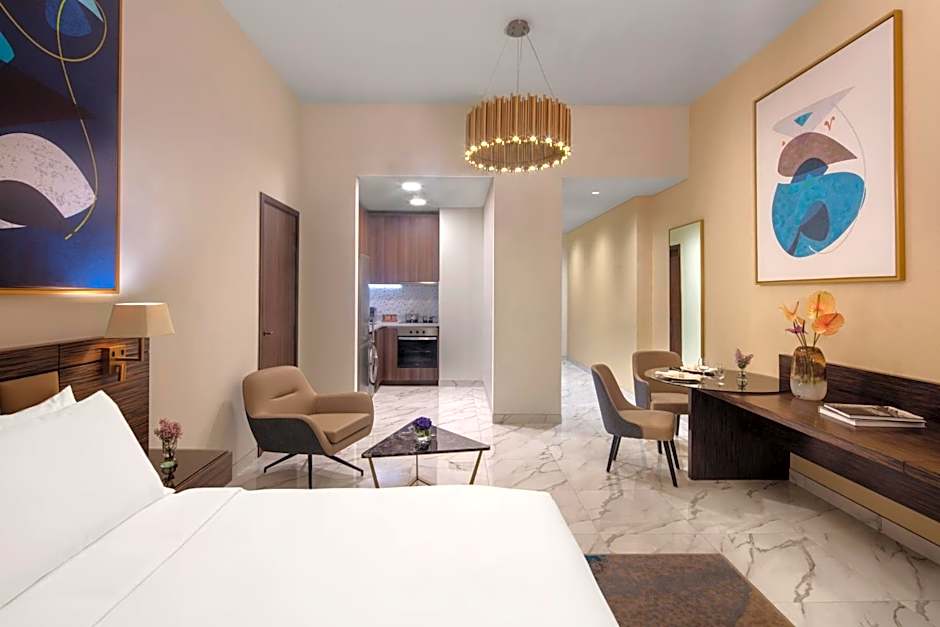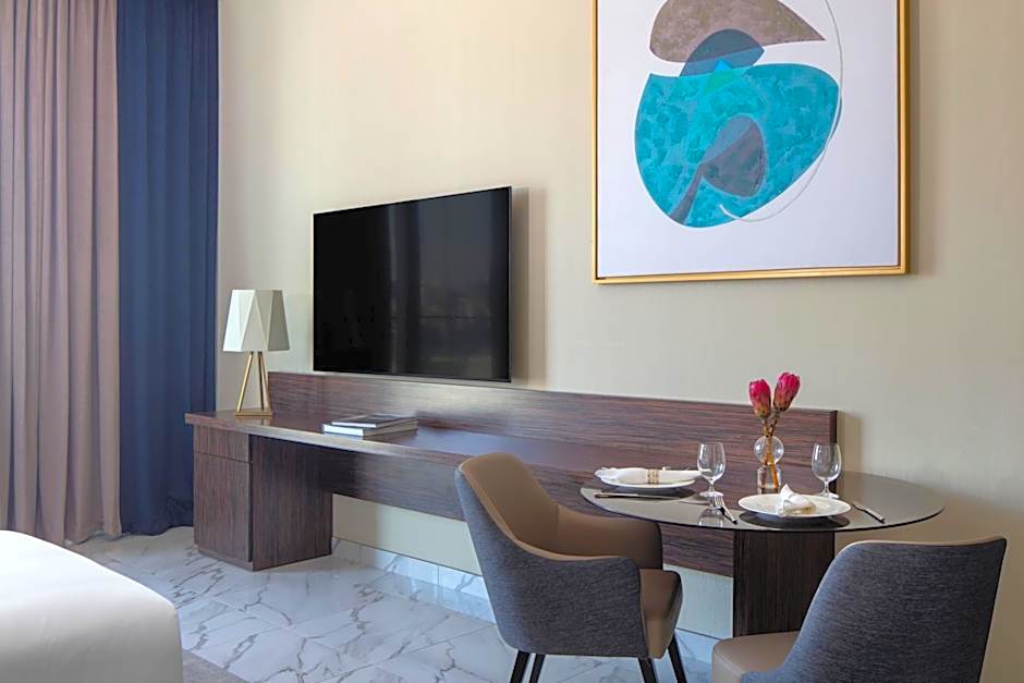 Studio Sea View is 441 square feet and includes a king-size bed 150-183 width plus extra beds on demand, desk, satellite tv , cable tv, tea and coffee making facilities , ironing set, bathrobes, and slippers.